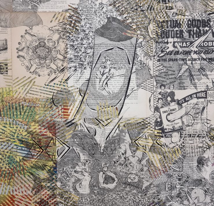 Επιπλέον, ο καθρέφτης, ένα άκρως συμβολικό αντικείμενο, είναι βασικό στοιχείο της πρακτικής του. Είναι αποφασισμένος να ξεπεράσει τα πραγματικά και αλληγορικά του όρια μέσα από μια μοναδική παλίμψηστη διαδικασία που περιγράφεται παρακάτω: Δημιουργεί μια εγκατάσταση με καθρέφτες. Η εξαιρετικά ανακλαστική σύνθεση φωτογραφίζεται χρησιμοποιώντας το iPhone του, έναν σύγχρονο καθρέφτη, ο οποίος ενισχύει τη ματαιοδοξία και τον ατομικισμό. Πραγματοποιεί μια ασπρόμαυρη xerox εκτύπωση της φωτογραφίας σε μεγάλες διαστάσεις με τα χρώματα να παραπέμπουν στις δυτικές θεμελιώδεις δυϊστικές δομές, έπειτα προστίθενται περισσότεροι καθρέφτες στην επιφάνεια και η νέα εγκατάσταση φωτογραφίζεται εκ νέου. Η διαδικασία επαναλαμβάνεται μέχρι να χαθούν οι ανακλαστικές ιδιότητες του καθρέφτη. Στη συνέχεια, ακολουθεί η διαδικασία της μεταξοτυπίας επιλεγμένων φωτογραφιών στον καμβά και εφαρμόζονται στρώματα ακρυλικής μπογιάς, μελανιού και φύλλων χρυσού, σύμβολο του θείου στις περισσότερες πνευματικές παραδόσεις.