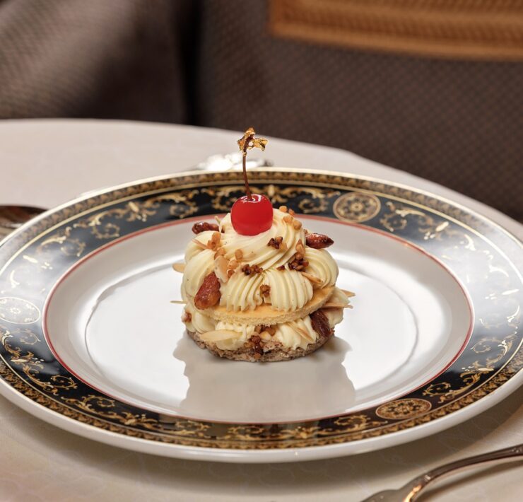 - Μους σοκολάτας γάλακτος με κρέμα βανίλιας, τραγανή επικάλυψη φουντουκιού και μαρμελάδα με κόκκινα φρούτα και τριαντάφυλλο.