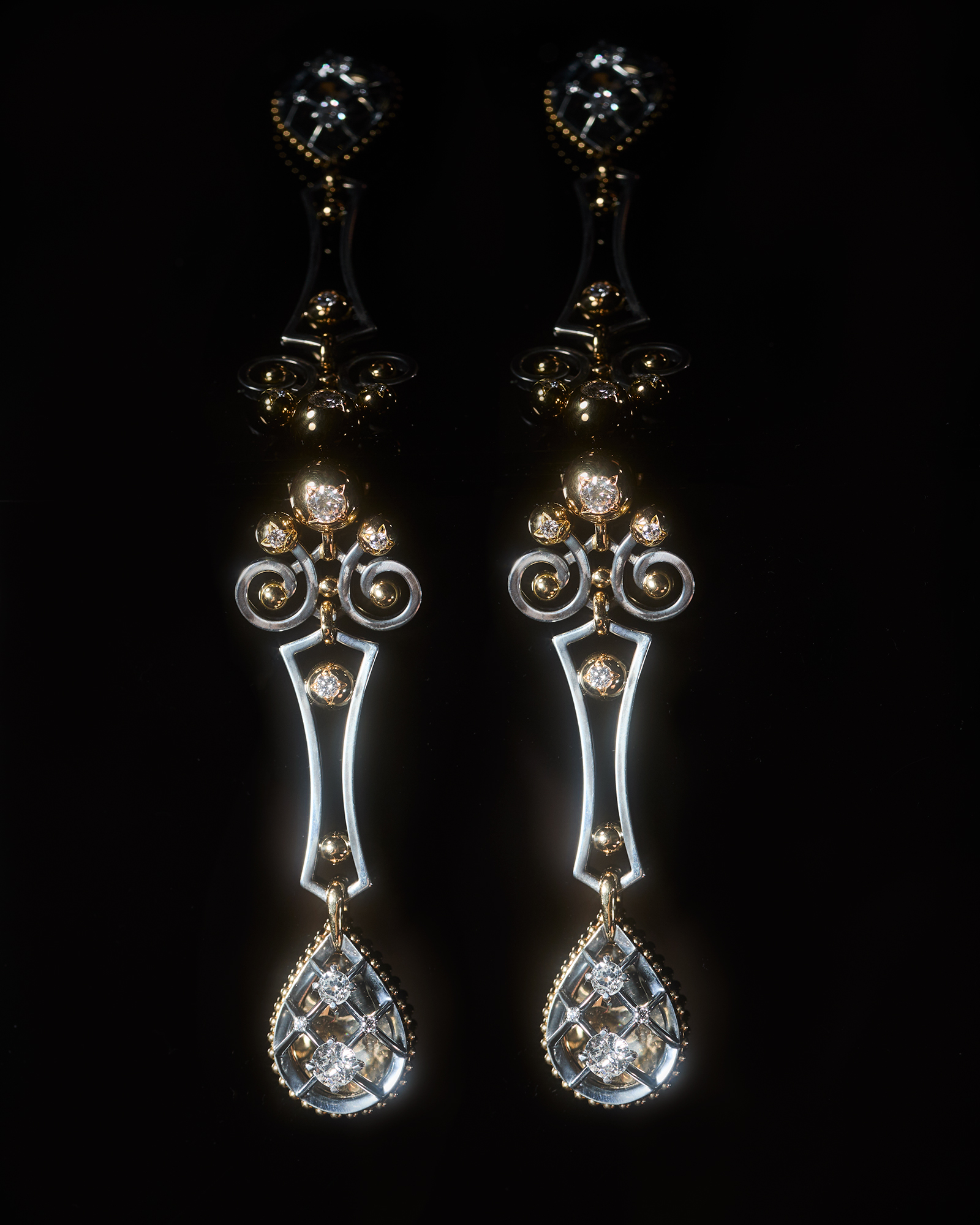 Διαμάντια παλαιάς κοπής, με τη φυσική τους ατέλεια, αιωρούνται σαν σταγόνες φωτός πάνω σε περίτεχνα ασημένια και χρυσά πλέγματα. Κάθε κόσμημα αφηγείται μια ιστορία γεμάτη ρομαντισμό και μυστήριο, εμπνευσμένη από το διαχρονικό αριστούργημα Επικίνδυνες Σχέσεις.