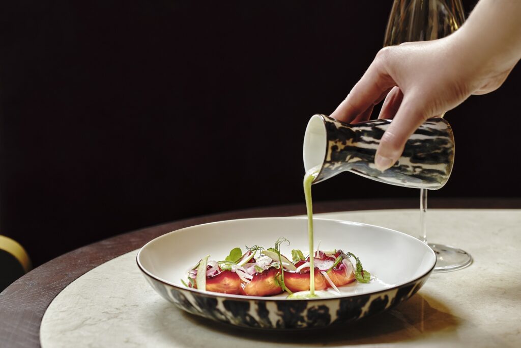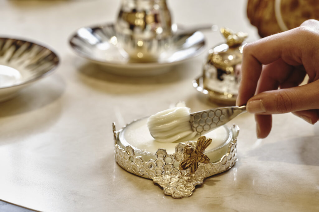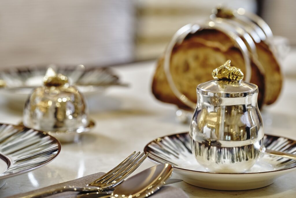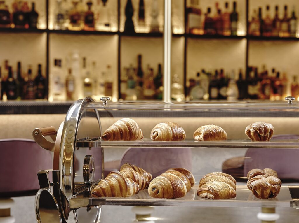 Όλα τα πιάτα του μενού παρασκευάζονται και σερβίρονται με σεβασμό στη φιλοσοφία της μηδενικής σπατάλης (zero food waste). Η εμπειρία κορυφώνεται με το εντυπωσιακό trolley viennoiserie, το οποίο φιλοξενεί λαχταριστά, χειροποίητα γλυκά και αλμυρά κρουασάν, που ετοιμάζονται με δεξιοτεχνία στο αρτοποιείο του ξενοδοχείου και παρουσιάζονται ζεστά, προσκαλώντας τους επισκέπτες να επιλέξουν επί τόπου τα αγαπημένα τους κομμάτια. Παράλληλα, μονοποικιλιακοί espresso, βοτανικά blends και εποχικά infusions προσθέτουν τη δική τους νότα με την ίδια ξεχωριστή φροντίδα που χαρακτηρίζει όλο το μενού.
