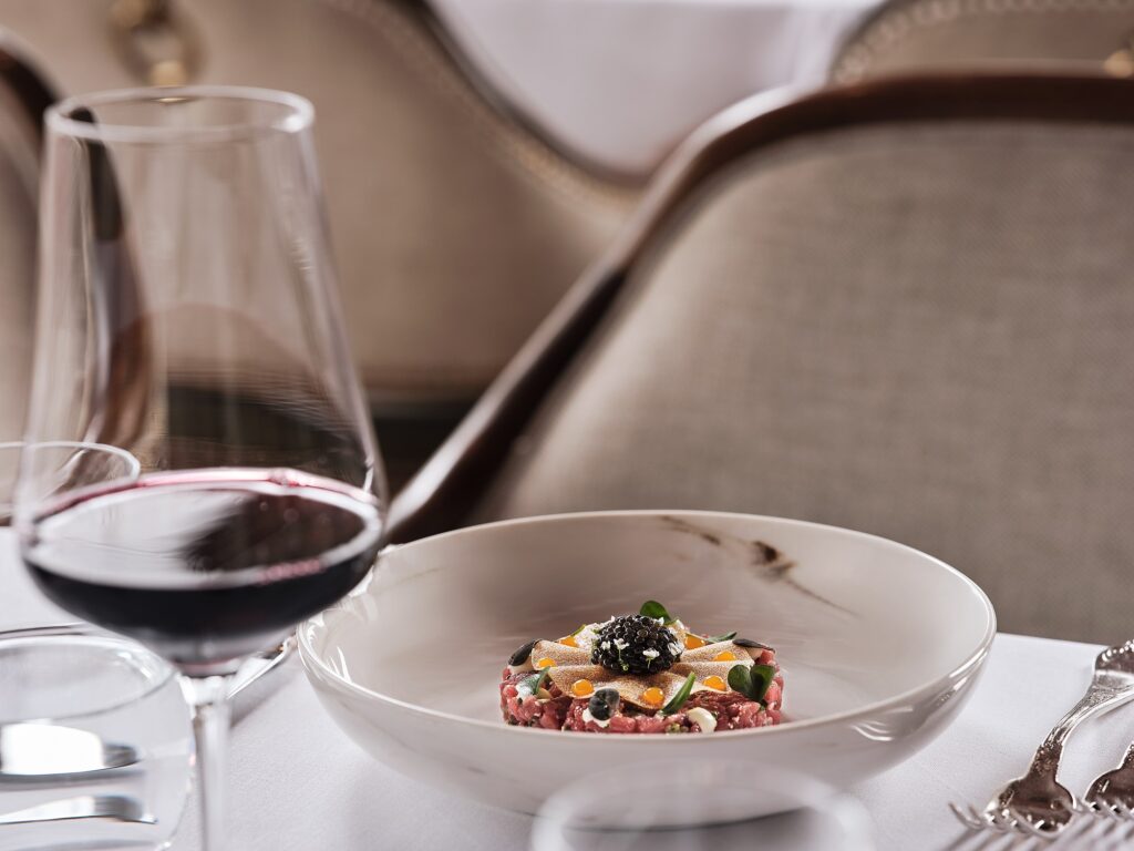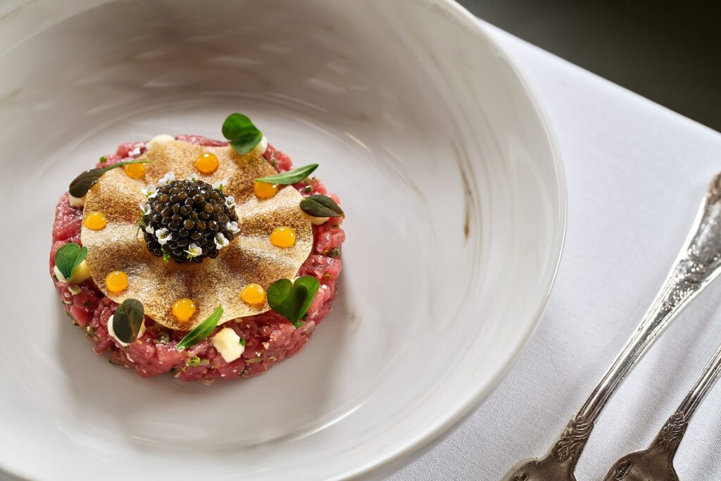 Το ανανεωμένο μενού του GB Roof Garden αποτυπώνεται σε πιάτα που αποπνέουν ισορροπία και γευστική πληρότητα. Στα ορεκτικά, το ταρτάρ από φιλέτο μόσχου συνδυάζεται με κρόκο αυγού κονφί, μαγιονέζα αγριοράπανου, ‘Rezzana’ Μετσόβου, χαβιάρι και τραγανά φύλλα πατάτας, ενώ το σιγοψημένο κουνουπίδι με μπαχαρικά, σταφίδα, κάπαρη, αμύγδαλα και τρούφα αναδεικνύει τη δυναμική των απλών υλικών.