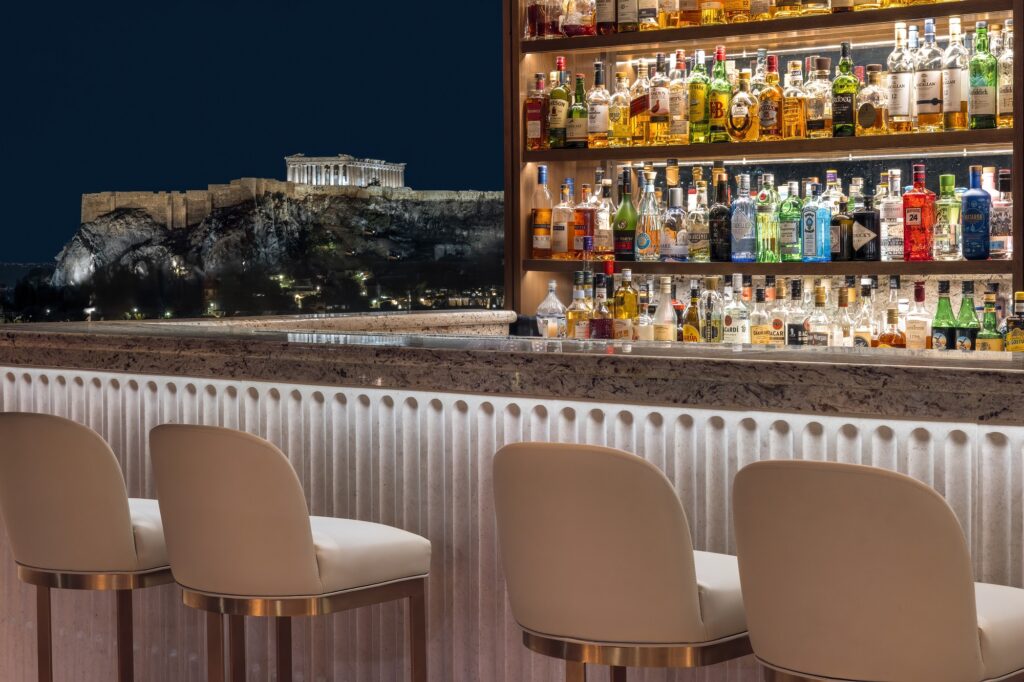 Παράλληλα, στο εντυπωσιακό GB Roof Garden Bar, οι επισκέπτες μπορούν να απολαύσουν signature cocktails από τη βραβευμένη ομάδα των bartender και προσεγμένες γεύσεις bar food menu με φόντο τον Παρθενώνα.